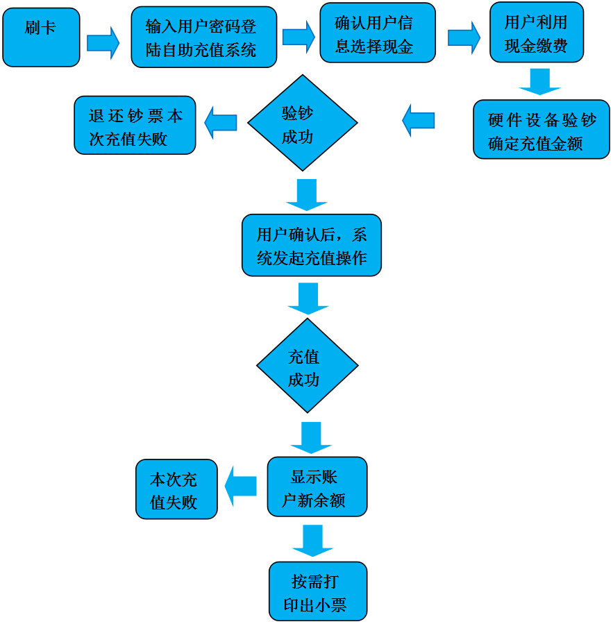 四、软件主要功能 1、总体设计目标: 通过客户自助服务系统软件,能够实现客户自助缴纳(现金缴纳)、查询客户信息以及其他相关信息。 客户自助服务系统要采用统一服务平台模式,所有终端交易通过系统自身服务器上送一卡通系统。 2、终端实现功能: ◆ 缴费功能 支持实现按现金缴费功能; 支持接受人民币1元及以上面额; 支持自动识别真假币; ◆ 查询功能 支持查询客户三个月内的充值及消费; 支持查询相关卡状态; 支持操作卡挂失; ◆ 日常管理 终端要能够记录一些核心交易情况和核心硬件的使用情况。以供出现异常时的查询; 终端要能够提供一些终端管理功能,如重启,关机等; 3、软件架构: 自助缴费系统采取B/S、C/S混合架构设计,终端用户操作界面采用C/S模式,终端监控、管理采用C/S模式,后台网管采用B/S模式; 自助终端服务器的数据库建在一卡通系统数据库里,自助终端服务器采用远程访问修改数据库数据; 4、缴纳充值流程图: