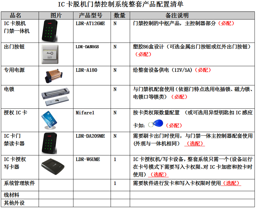 系统概述 随着高科技的蓬勃发展和信息产业的日异革新以及网络的迅猛发展,智能卡技术已被社会的各行各业所接受并应用,其中非接触式智能化门禁管理系统已经走进了人们的生活, 因其技术的先进、使用的便利、保密安全等特性越来越广泛地应用在各个领域,为适应信息的时代需要, 作为跨世纪使用智能化管理系统,如何实现智能化建筑和公共场所的管理控制,必须在功能上满足当前和未来发展的需求, 以满足文化和经济发展的需要。 感应式IC卡出入管理控制系统(简称智能化识别控制管理系统),具有对门户出入控制、人员考勤管理、实时监控、保安防盗报警等多种功能,它主要方便内部员工出入,杜绝外来人员随意进出,既方便了内部管理,又增强了内部的安保,从而为用户提供一个高效和具经济效益的工作环境。 感应式IC卡出入管理控制系统,在功能上实现了通讯自动化(CA)、办公自动化 (OA) 和管理自动化 (BA), 以综合布线系统为基础,以计算机网络为桥梁,全面实现对通讯系统、办公自动化系统的综合管理。 该智能化识别控制管理系统是为了有效的控制人员的出入,并且记录所有出入的详细情况,来实现出入口的方便、安全、快捷的管理,包含发卡、出入授权、实时监控、出入查询及打印报表等;该系统作为一项先进的高科技技术防范和管理手段,在一些经济发达的国家和地区已经广泛应用于科研、工业、博物馆、酒店、商场、医疗监护、银行、监狱等,特别是由于系统本身具有隐蔽性、安全性、管理性、及时性等特点,已经在许多领域的应用越来越广泛,该系统不仅具有安全性,同时提高了管理效率,提升了单位形象。 一、系统建设基本目标 : 智能化识别控制管理系统是建立在先进的计算机技术、通信技术及非接触式IC卡技术之上,为出入控制提供安全、方便的管理。并在单位场所内做到统一管理,统一建设,实现一卡在手管理无忧,针对具体目标为: • 持有效卡人能很方便地进出门道。 • 无卡或持无效卡的人不能进出门道。 • 出现异常情况有紧急应对措施。 • 支持可通过电脑软件方便设置用户使用的基础信息。 • 支持有效卡在设定的开门时长、卡类、机器运行模式等。 • 支持管理人员能随时控制每张卡的进出权限,可控制什么人在可进入哪道门,可依据权限设定。 • 产品使用的安全性要高,使用提示信息丰富,需要防破坏性提醒功能。 • 经济合理的运营成本。 二、系统设计所遵循的主要规范: •《国际综合布线标准》 ISO/IEC11801 •《民用建筑电气设计规范》JGJ/T 16-92 •《中华人民共和国安全防范行业标准》 GA/T74-94 •《中华人民共和国公共安全行业标准》 GA/T70-94 •《监控系统工程技术规范》 GB/50198-94 三、系统的功能和作用: 脱机型IC卡门禁一体机是IC卡一卡通系统的子系统之一,同时也是综合保安系统的重要组成部分,其设计之主要目的是为实现人员出入权限控制。当人员进门时只需持卡靠近读卡器进行读卡,读卡器接触到卡片信息后,门禁控制器首先判断该卡号是否合法,如合法则发出“滴”一声,绿灯点亮,同时开锁,并将该卡号、日期、时间等信息保存以供查询。否则门不打开,红灯亮,蜂鸣器发出“滴滴”两声。可以大大树立各种公场所规范化管理形象,提高管理档次,同时规范化内部的管理体制。 一张感应卡可以代替所有的大门钥匙,且具有不同的通过权限,授权持卡进入其职责范围内可以进入的门,可以将不受欢迎的人员拒之门外,例如可以杜绝传销、保险等行业的业务员在未经许可的情况下擅自闯入您的私有场所,干扰您正常的管理秩序。 如果人员的感应卡遗失了也可以在设备上即时挂失,这样即使其他人捡到了该感应卡也无法进入场所,这样相对与普通机械锁要方便得多,您不必为了安全起见重新换锁,为每个人重新配钥匙。对于离开的人员感应卡采用禁用的方式,该人员以后都无法进入场所进行窃取或破坏等报复活动,如果您不采用感应卡门禁管理方式,您恐怕为了以防万一必须多次更换大门的锁。 四、系统设备的主要组成模块 • 感应卡:存储用户的不可复制和解密的卡号。 • IC卡脱机门禁控制器:核心控制中心,可进行修改编程密码、注册卡片、注册密码、删除注册卡、删除密码、设置开门时间、设置机型模式(写卡模式或读卡模式)等功能 。 • 读卡器:通过射频感应工作原理,识别感应卡内置加密卡号(需要出门刷卡时选配,与控制器配套使用)。 • 安防通讯转换器:门禁机与电锁之间通过安防通讯转换器实时通讯通讯协议校验检测,完全杜绝传统产品剪线开锁的弊端,大大提升了整套系统的安全性(可选) • 控制电源:提供系统运作电源和电锁的执行结构的电源供应,两路电源输出,一路给控制器和读卡器供电,一路给电锁供电;且支持双路互锁保护,即防止主控电源异常后,电锁电源持续工作而引起打不开门。 • 电锁:直接控制门的开关,电动执行机构。 • 出门按钮:使用按钮开门,出门可设定为按按钮出门。 • IC卡写卡器:IC卡授权加密和写入卡的信息使用,与管理软件配套使用,可以写入卡的有效信息(可选)。 • 管理软件:设置管理卡、用户卡、通用卡信息;通过配套的写卡软件直接写入机器密码,用户卡使用门的权限、可设定开门的时长和机号、对应的门的地址信息(可选) 五、IC卡脱机型(无记录型)门禁一体机