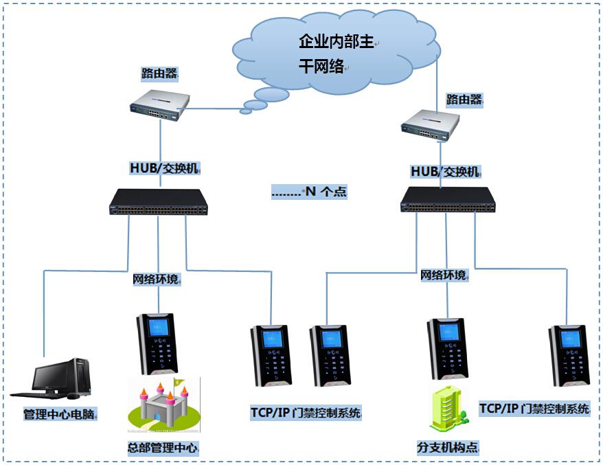 本系统可通过充分利用企业内部网络资源,实现企业内部网跨地域的集中式的统一管理系统管理,适用于单位地点分散在各个地区,但是单位内部拥有自己的企业网络 ,如 网络带宽超过几十兆,可以实现总部对分部的管理,也可依据设定的管理权限实现分部的自行管理。并能够实现门禁数据的共享。例如:在某一地域内中的大型连锁企业对各个下属分支机构通过内部网组建的门禁系统的统一化管理。