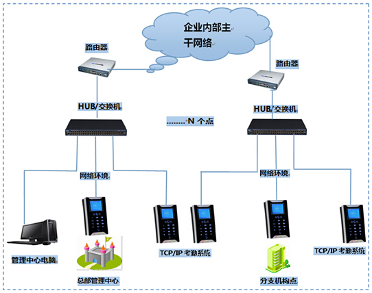 ◆Internet企业内部网系统架构解决方案图 本系统可通过充分利用企业内部网络资源,实现企业内部网跨段的集中式的统一系统管理,适用于单位地点分散在各个地区,但是单位内部拥有自己的企业网络,如网络宽带超过几十兆,可以实现总部对分部的管理,也可依据设定的管理权限实现分部的自行管理,并能够实现考勤数据的共享。例如:在某一地域内的中大型连锁企业对各个下属分支机构通过内部网组建的考勤系统的统一化管理。