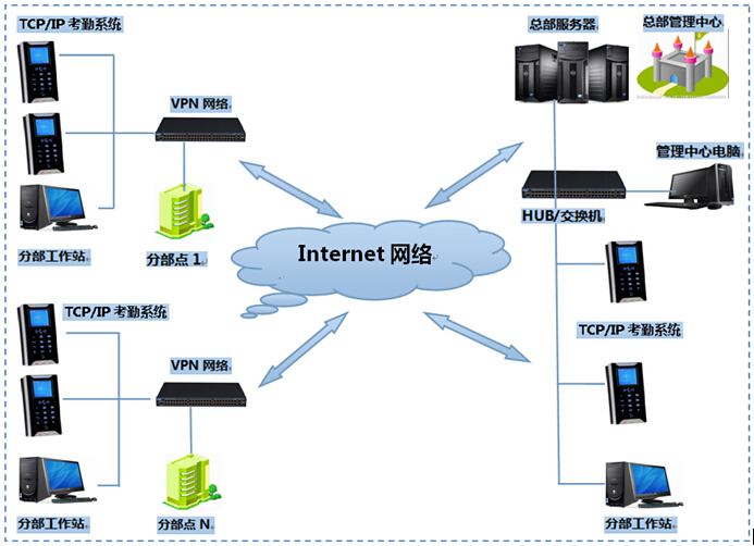 ◆ Internet互联网考勤系统架构解决方案图 适用于分支机构分布在各地,总部可通过互联网对各地的分支机构的考勤进行集中式的统一管理,通过一定的权限设置,有权限的人员到任何一个公司所属地都可实现对考勤控制;由总公司集中统一管理,特别适用于中大型的连锁性机构或单位的应用。