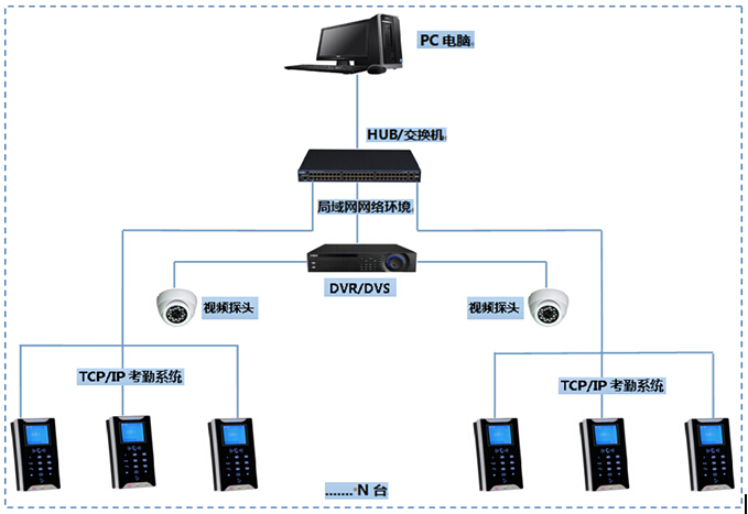◆ 安防监控视频拍照与考勤系统联动架构解决方案图 安防系统中的硬盘录像机(DVR),直接通过集线器或HUB通过网络线将视频探头与电脑连接,当人员在考勤设备上刷卡后,刷卡信息直接传输至电脑,电脑直接发送指令至视频服务器驱动探头拍照,将该拍照图片信息直接通过网络传输至电脑,图片以文件的形式存储在硬盘,便于日后的浏览和管理工作。通过安防系统联动拍照功能可以实现远程监视人员的刷卡和记录刷卡时的图片,可将原始人员照片与当时刷卡照片同时显示,便于管理人员进行事后的图片对比(拍照保存完全区别于其他产品的截图保存,抓拍保存信息更加完整),有效解决了单位内部日常考勤纠纷的矛盾问题,同时可有效杜绝单位内部人员替打卡现象。