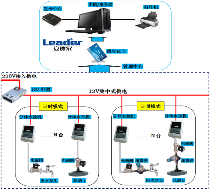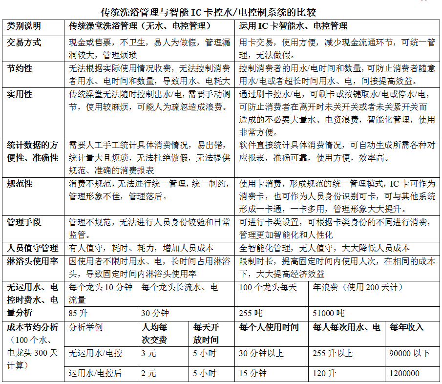 我公司经过广泛的市场调研和深度分析,经过长时间的大量的实践和努力自主开发了智能IC卡水控系统,并在社会上广泛使用。此产品的推出可让用户按管理需求实现个性化用水,给水资源管理者提供了科学有效的解决方案,时同也是为国家能源节约提供新的思路。我公司研制的感应式IC卡节能控制系统不仅能达到节约用水/用电,同时能达到提高效率、合理收费、科学管理、信息共享的目的。深受广大用户的欢迎。同时,可以为当今能源节约提供一种新的思路,为资源合理利用提供了可能。 选择使用我公司生产的IC卡控水收费系统,可通过计量或计时模式的科学收费,科学有效的控制用水,可节约用水80%左右,避免了无谓的浪费;同时使用者合理、精确的收费,解决了现金收费带来的管理漏洞和诸多不便问题,避免了使用澡票带来的繁琐和一张澡票洗半天的浪费现象。使用者持卡洗澡,绝对的实行了谁用水谁付费,用多少付多少合理收费的原则,合理公平分配了用水,养成使用者勤俭节约的习惯,减轻了合作单位或后勤部门的经济负担。同时由于本系统的搭建,为今后实行一卡通平台系统搭建了网络平台,可实现一卡通名数据的统一管理和信息共享,使得管理更加科学化,精细化、集中化,彻底改变了单位后勤部门管理混乱、数据资源统计繁琐,管理落后、信息化资源分散的旧局面,为科学、有效化、智能化、信息化大数据的管理奠定了基础,大大提高了使用单位的管理效率和提升了单位信息智能化管理的形象和档次。 一、传统洗浴管理与智能IC卡控水/电控制系统的比较: