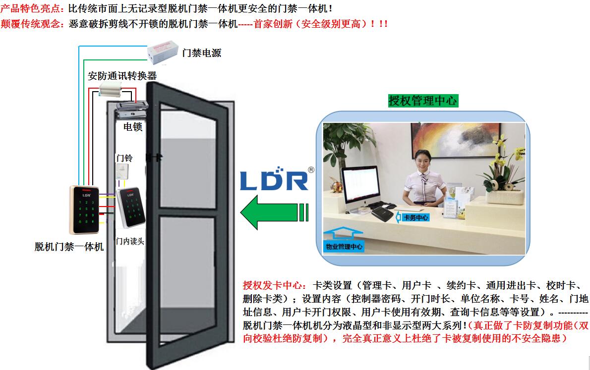 产品型号:LDR-AT128ME • IC卡防复制一体机,无需专门定制卡类,设备直接实现防复制,设备直接识别复制卡; • 金属材质,户外防水结构设计,完全户外低温使用,高端外观设计; • 全触控按键操作,上电后彩光透衬, 独有的防湿手指触控无效和防乱触控死机设计,触控永不死机,完全杜绝非常规误操作造成的设备使用卡死现象; • 支持Mifare频率的13.56MHz非接触式射频; • 读卡扇区可自定义,方便系统集成需要; • 运行模式:同时支持读IC卡序列号和卡号双模式运行,模式可自行切换; • 控制门数:1道门; • 控制方式:支持进、出双向刷卡控制; • 输出:1组WG 、1组门磁、1组门铃、1组开关输出;预留RS485接口; • 开门方式:刷卡或密码; • 卡权限:读卡号模式为65535张卡, 读序列号模式为40000张卡; • 开锁类型:常开、常闭可选; • 功能设置:可设置管理卡、用户卡、通用卡、校时卡信息;写入机器对应密码,用户卡使用哪道门的权限、查询卡信息、用户卡的使用有效期限,删除卡管理、可设定开门的时长、机号、对应的门的地址等等 • 感应距离 5~10CM; • 安全性:可选配加载我公司安防通讯转换器,实现破拆剪线短路不开锁,真正做到了控制的安全性 • 开发平台:ARM ; • 是釆用先进的射频接收线路设计及嵌入式微控制器,结合高效译码算法,具有接收灵敏度高、工作电流小、单直流电源供电、性能高等特点; • 工作电压 DC12V; • 工作电流 ≤100mA; • 工作环境 -20℃~70℃; • 尺寸规格:76mm*120mm*20mm(支持低温户外使用)(银色和豪金色可选)